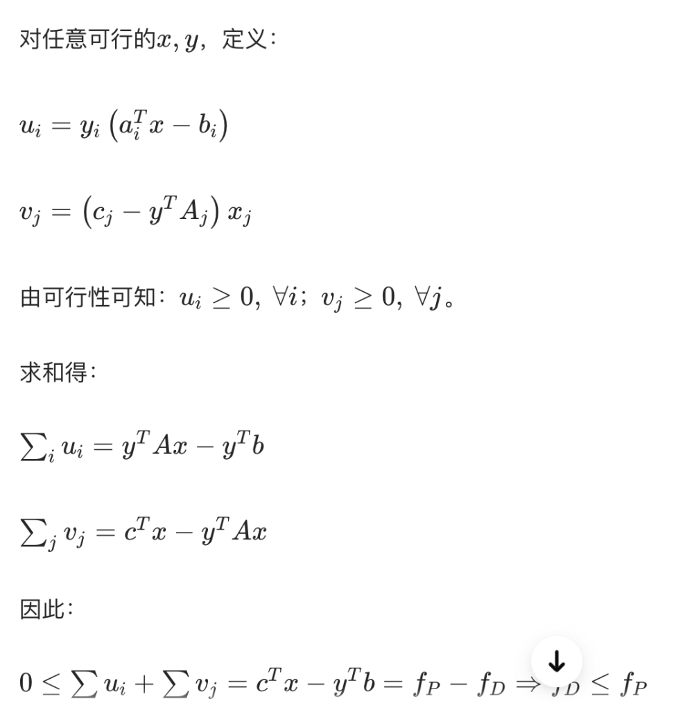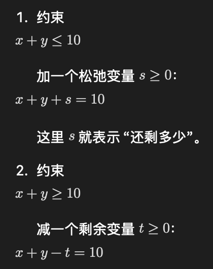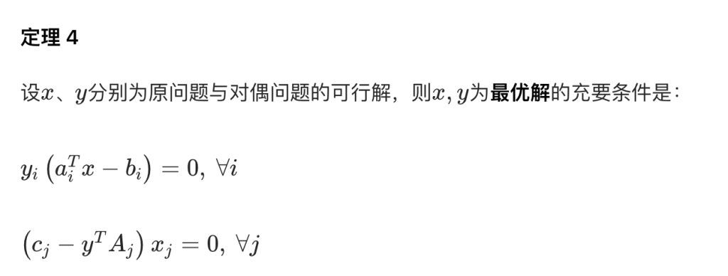 • 直观含义:最优解处,约束的松弛 / 剩余变量对应对偶变量的乘积为 0。