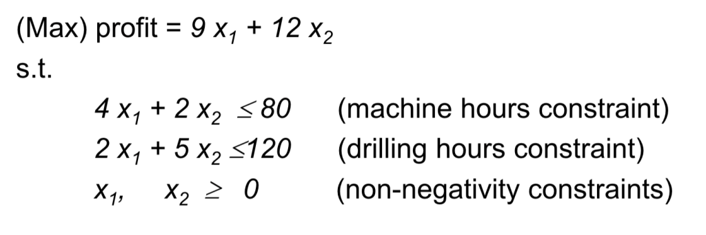 每周机器工时的最大可用量为 80 小时,钻孔工时的最大可用量为 120 小时。