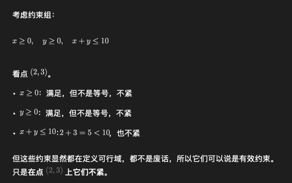 • 紧约束一定是有效约束,如果一个约束在你关心的点上已经取等号了,说明这个点正好压在它的边界上。那它显然不是完全没用的约束,至少在这个点它确实起了限制作用。