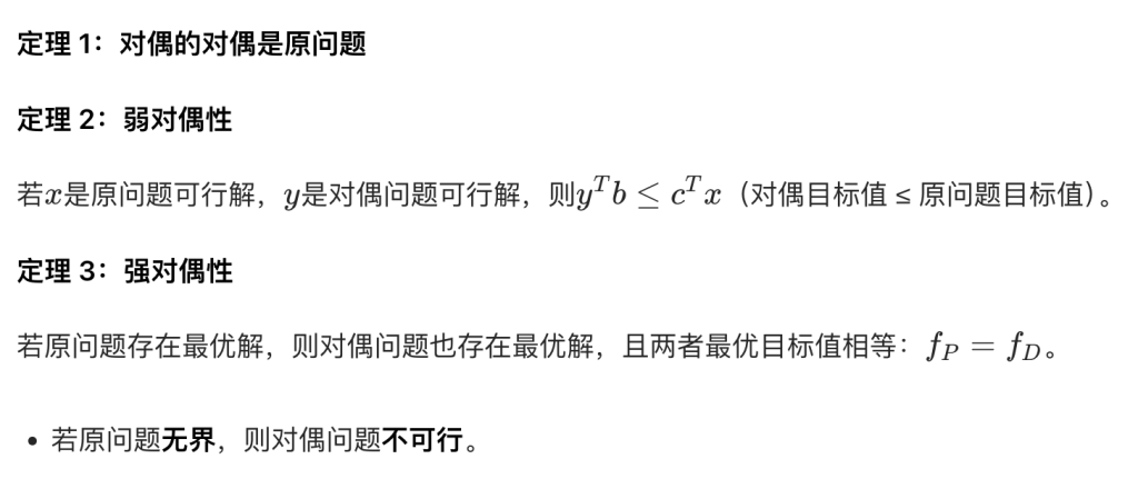 3. 若原问题无界,则对偶问题不可行。