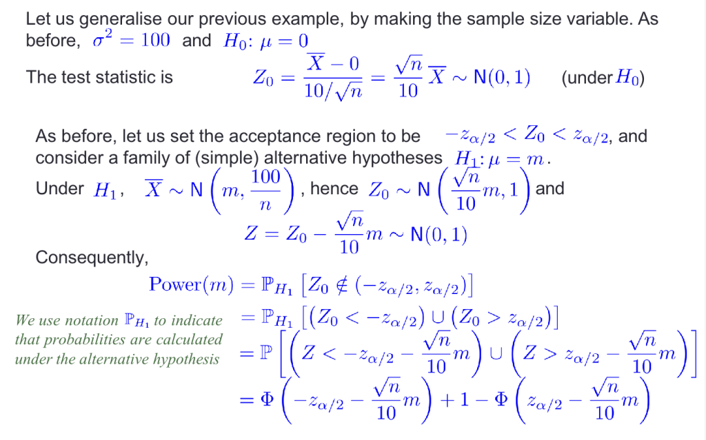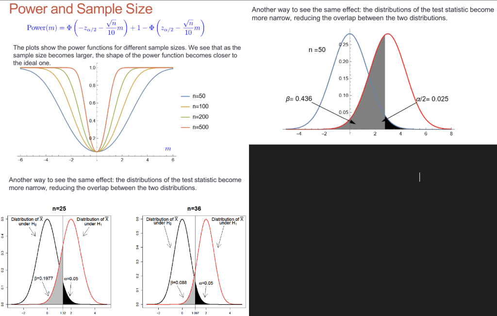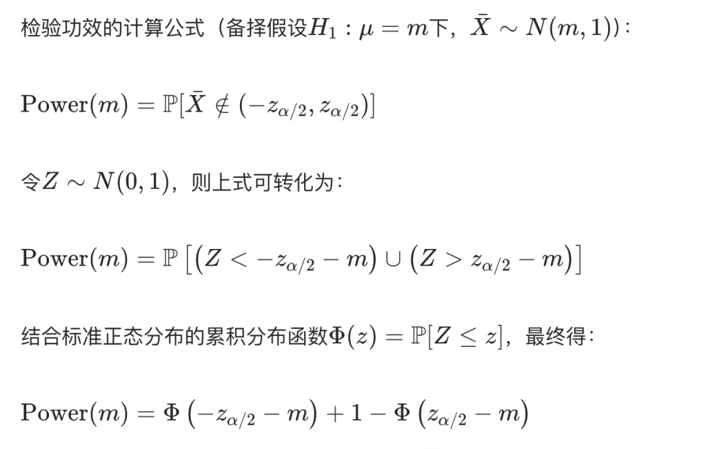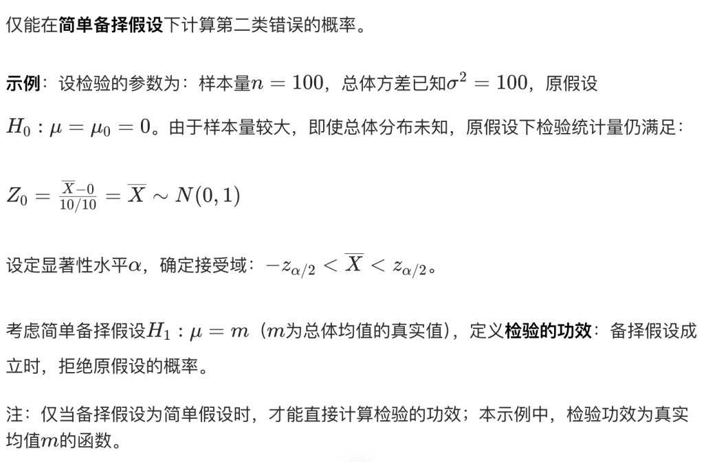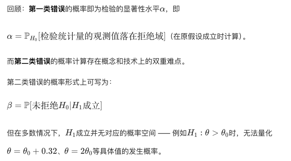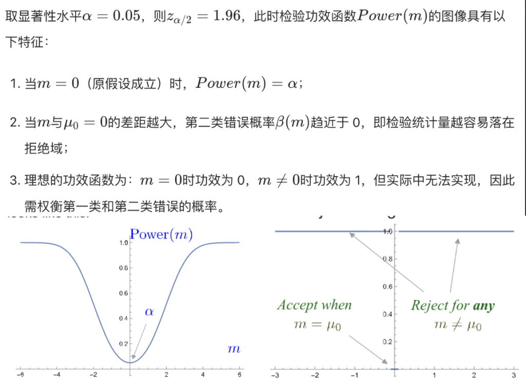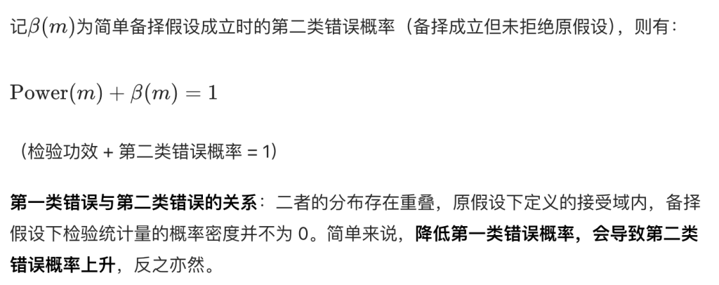样本量的影响 1. 功效函数:样本量越大,功效函数越接近理想形态($m=0$ 时功效为 $0$,$m \neq 0$ 时功效趋近于 $1$); 2. 分布形态:样本量越大,检验统计量的分布越“陡峭”,原假设与备择假设的分布重叠越少,第二类错误概率越低; 3. 核心结论:增大样本量可同时降低第一类和第二类错误的概率,是提升检验效果的有效方式