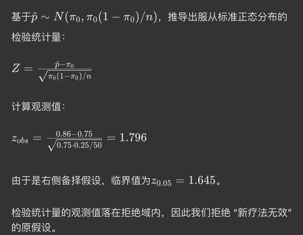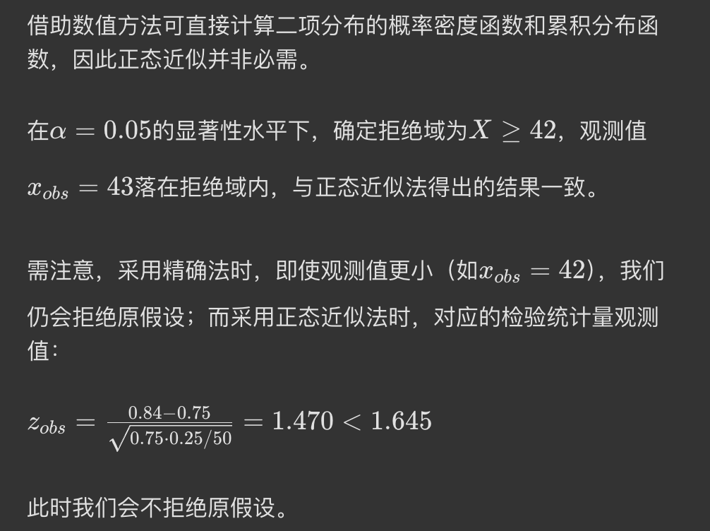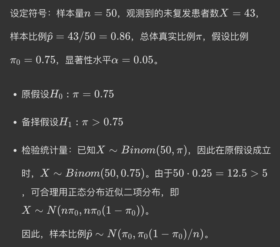例 3:对一种新的药物疗法进行测试。研究中,50 名患者经过数月治疗后,43 名病情未复发。若不采用该药物疗法,病情未复发的患者预期比例为 75%。在 0.05 的显著性水平下,检验新疗法是否提高了病情未复发患者的比例