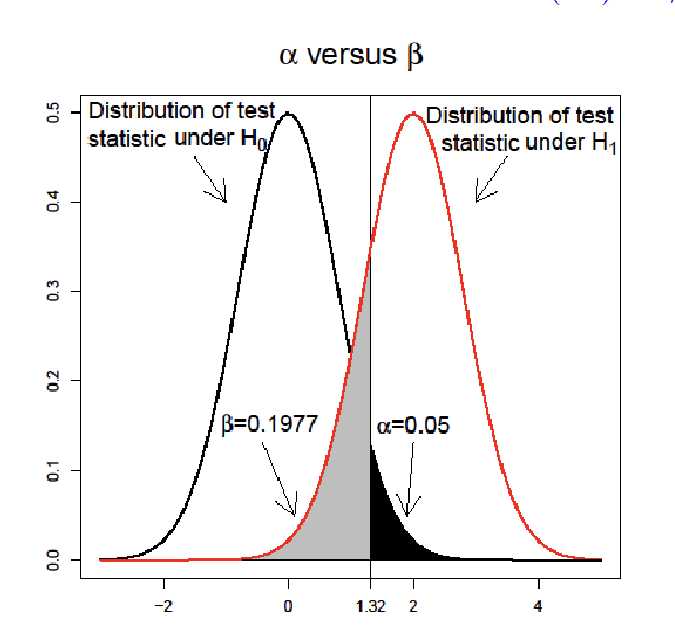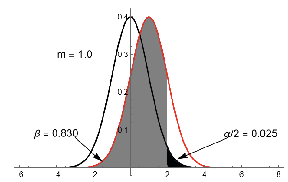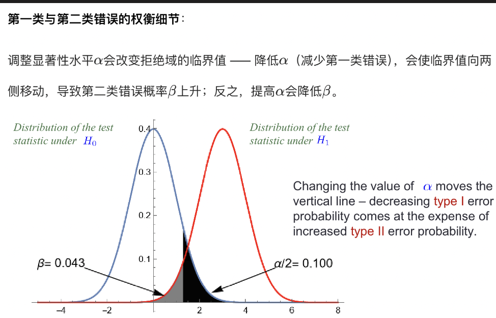 当然,如果备择假设下检验统计量的取值与原假设的取值相差越大,平衡这两类错误的难度就会越低。本模拟中我们固定显著性水平,仅改变(简单)备择假设下的均值取值