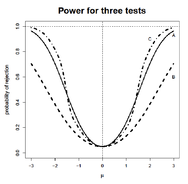 可通过**检验功效**对比不同检验方法的优劣。 示例:有 A、B、C 三种检验方法,均用于检验 $H_{0}: \mu = \mu_{0}$ vs $H_{1}: \mu \neq \mu_{0}$,且三种方法的显著性水平相同。 通过功效函数图像可得结论: 1. 检验 B 的功效在所有 $m$ 下均低于(或等于)A 和 C,因此检验 B 无使用价值,称 A 和 C **一致地比 B 更有效**; 2. 检验 A 和 C 的功效各有优劣:A 在检测与原假设的**小偏差**时更有效,C 在检测与原假设**的大偏差**时更有效。