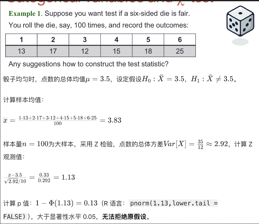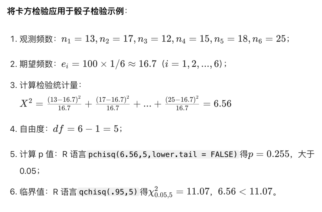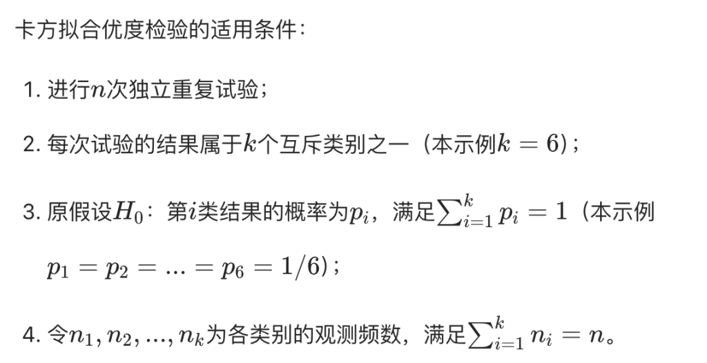 • 均值检验未利用 “各点数概率相等” 的细节,卡方检验可直接检验每个结果的概率是否符合假设,更贴合问题本质。