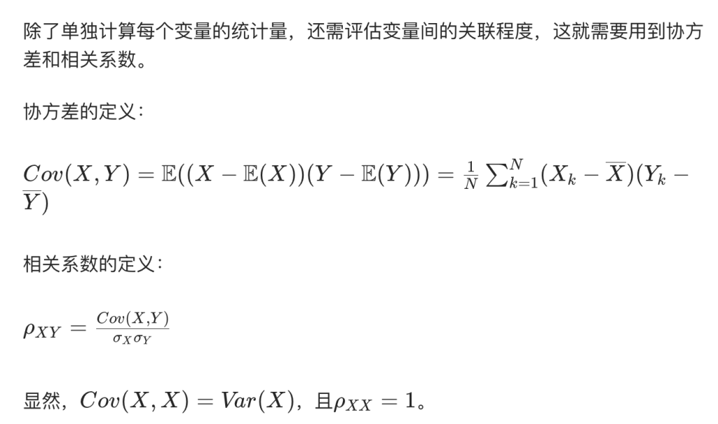 协方差和相关系数用于描述变量间的关联强度: