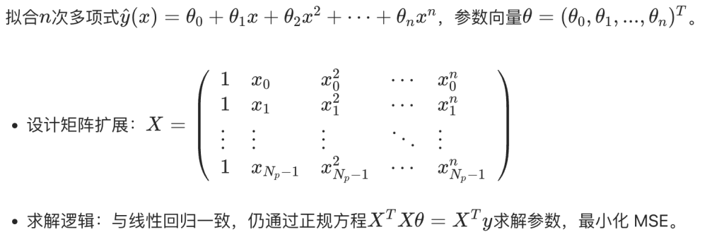 - 二次多项式:设计矩阵包含 1、x、\(x^2\)列,拟合曲线比直线更贴合部分数据波动。