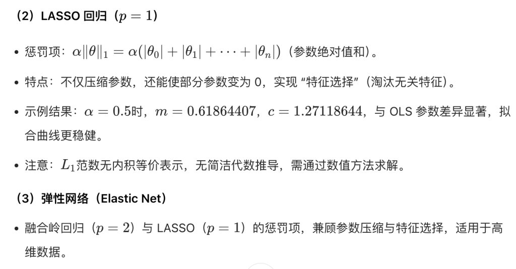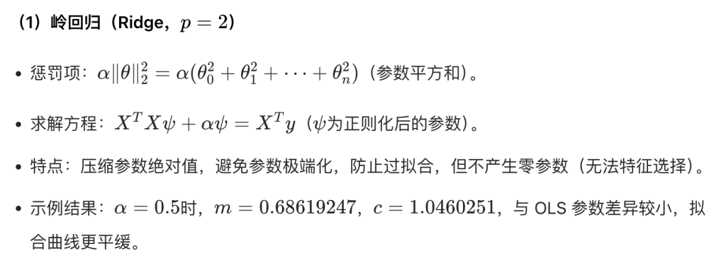 - \(\alpha \geq0\):正则化参数,\(\alpha=0\)退化为普通 OLS,\(\alpha<0\)无意义(惩罚项为负,无法约束参数)。