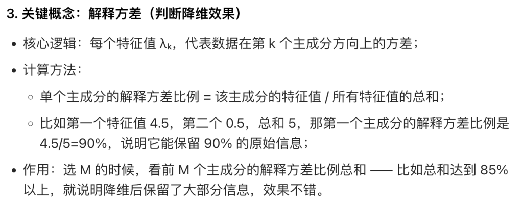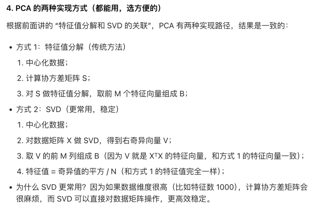 通俗说:找几个 “主成分”(其实就是前面讲的特征向量),让数据投影到这些主成分上后,“方差最大”—— 方差越大,说明保留的原始信息越多;专业说:找到一个矩阵 B,让数据 X 乘 B 再乘 B 的转置(Z = X B Bᵀ),Z 是 X 的近似(重构),重构误差(原始数据 X 和重构数据 Z 的差距)最小。