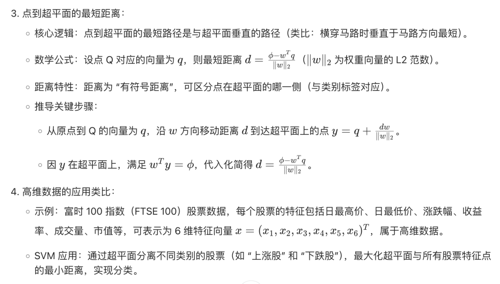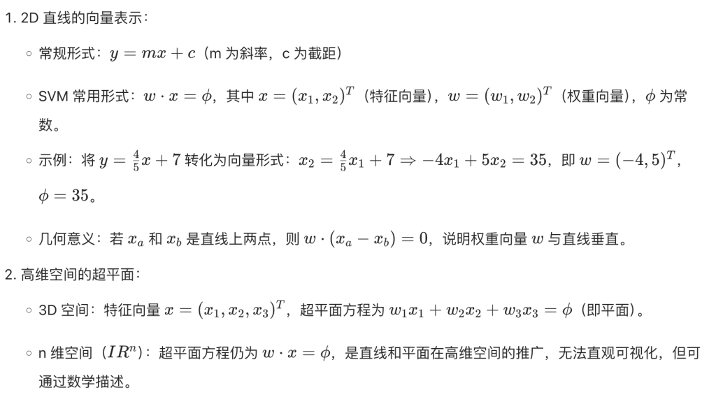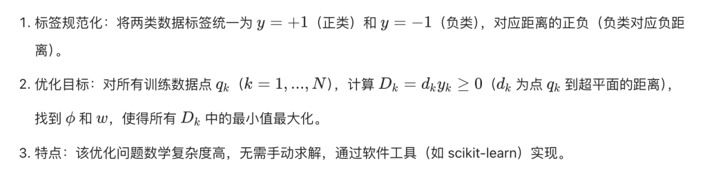 SVM 的核心是找到 “最优决策边界”—— 即位于两条平行分离线正中间的直线,这两条平行分离线需尽可能远离,它们之间的间隙称为 “分离间隔(separating margin)”,SVM 目标是最大化该间隔。间隔最大化的意义:间隔越宽,未见过的测试数据和未来数据落在正确分类侧的概率越高,模型泛化能力越强