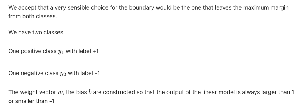 我们认为,决策边界的一个非常合理的选择是:与两个类别都保持最大间隔的那条边界。