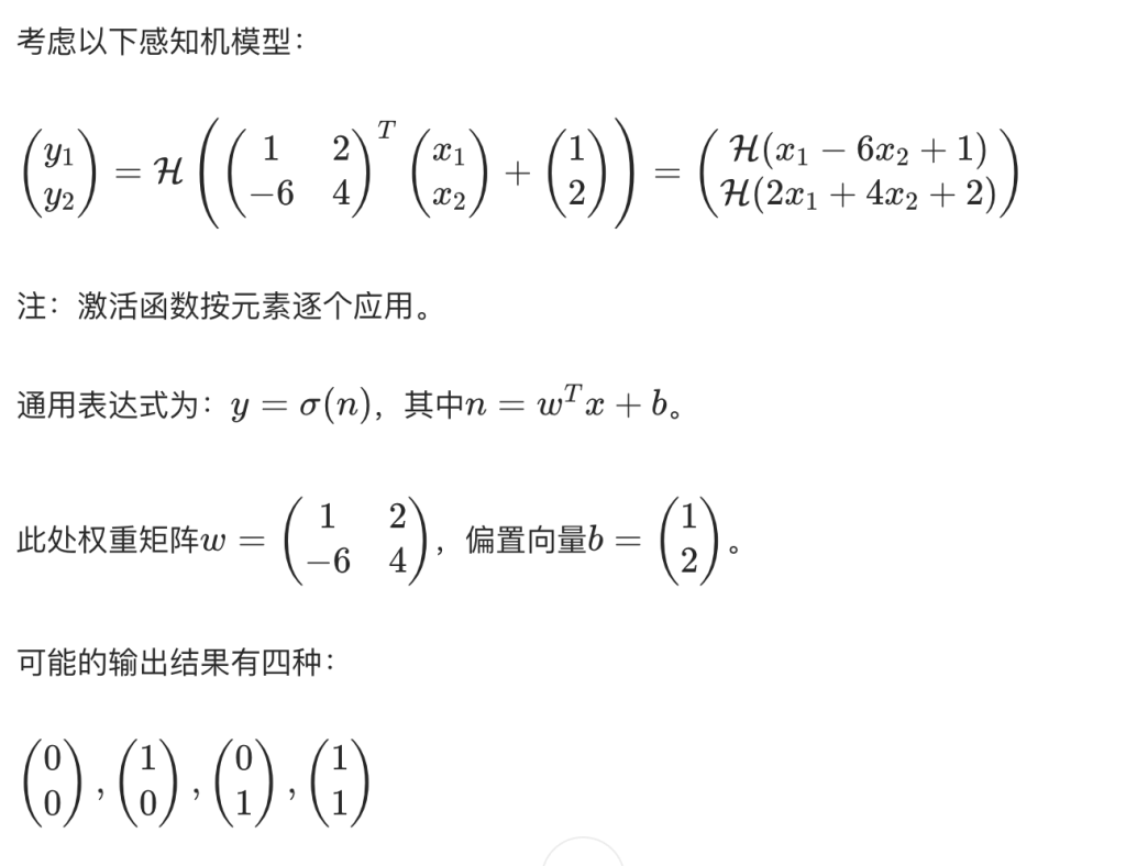 感知机是一种计算单元,它接收一个数值输入向量x,并通过权重向量w对其进行线性组合,随后可添加一个数值偏置b,得到一个实数结果。