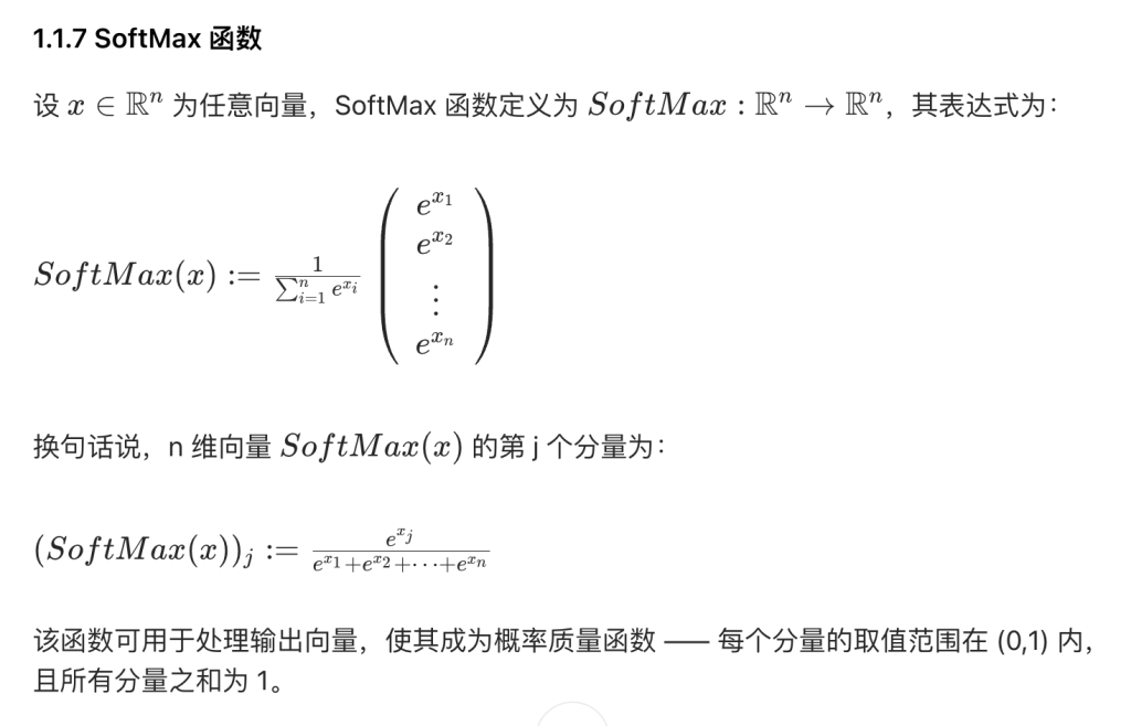 通俗理解:分子是 e 的 x_j 次方(放大差异),分母是所有 e 的 x_i 次方和(归一化),最终结果每个元素在 0-1 之间,总和为 1,完美适配交叉熵损失