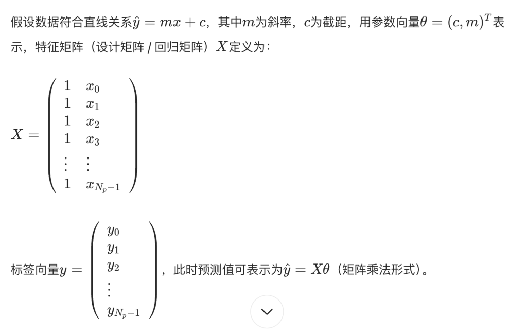 - 特征矩阵X:每行对应一个数据点,列包括 1(截距项)和p个特征,形式为:\(X=\left( \begin{array} {llll}{1}&{x_{1,1}}&{x_{2,1}}&{\cdots }\\ {1}&{x_{1,2}}&{x_{2,2}}&{\cdots }\\ {\vdots }&{\vdots }&{\vdots }&{\ddots }\end{array} \right)\)
