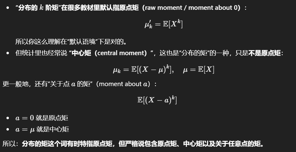 对任意随机变量X,其概率分布的 1 阶矩即为X的期望\(\mathbb{E}(X)\)(将\(m = 1\)代入上述m阶矩的定义式即可验证)。