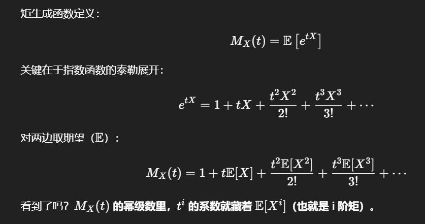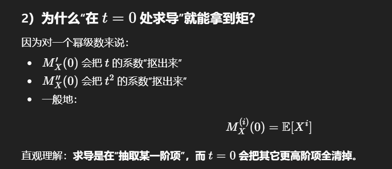 矩生成函数关于t的i阶导数在\(t = 0\)处的取值,等于该分布的i阶矩(其中\(i = 0,1,2,\dots\))