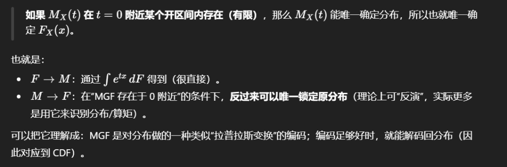 矩生成函数\(M_X(t)\)与随机变量X的累积分布函数\(F_X(x)\)之间存在一一对应关系