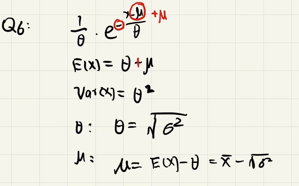 Q6. exponential分布,注意加常量是针对X,所以如果是-(X+b)最终期望应为-b